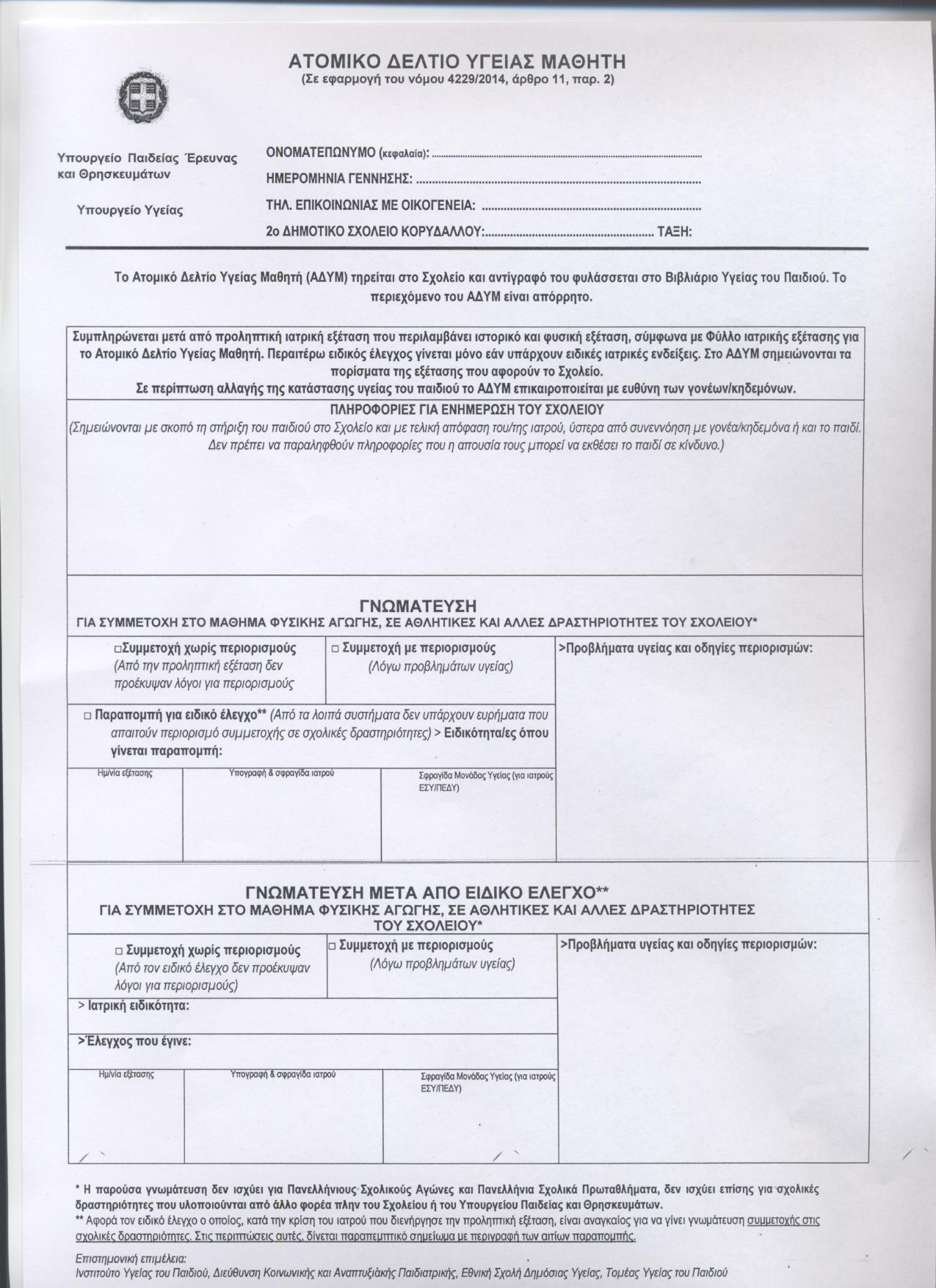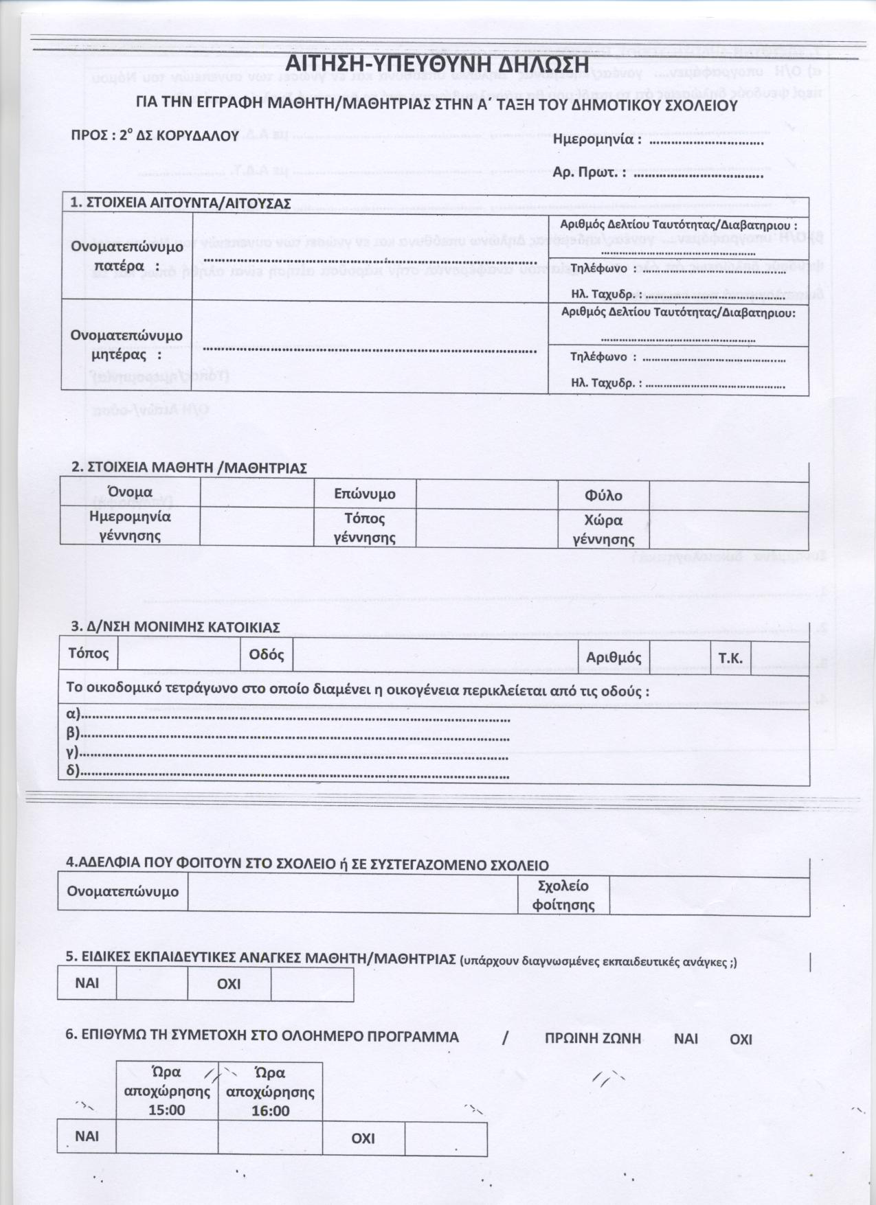 Οι εγγραφές των μαθητών/-τριών που θα φοιτήσουν στην Πρώτη Τάξη του Δημοτικού Σχολείου, κατά το σχολικό έτος 2019-2020 αρχίζουν την Δευτέρα 6 Μαίου 2019 και λήγουν την Δευτέρα 20 Μαίου 2019.